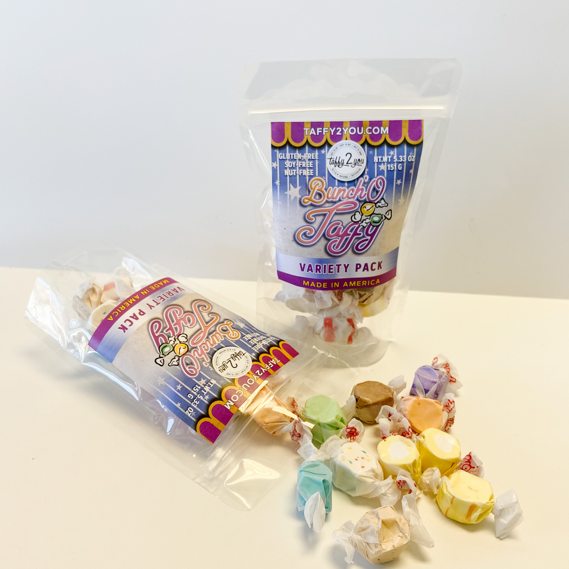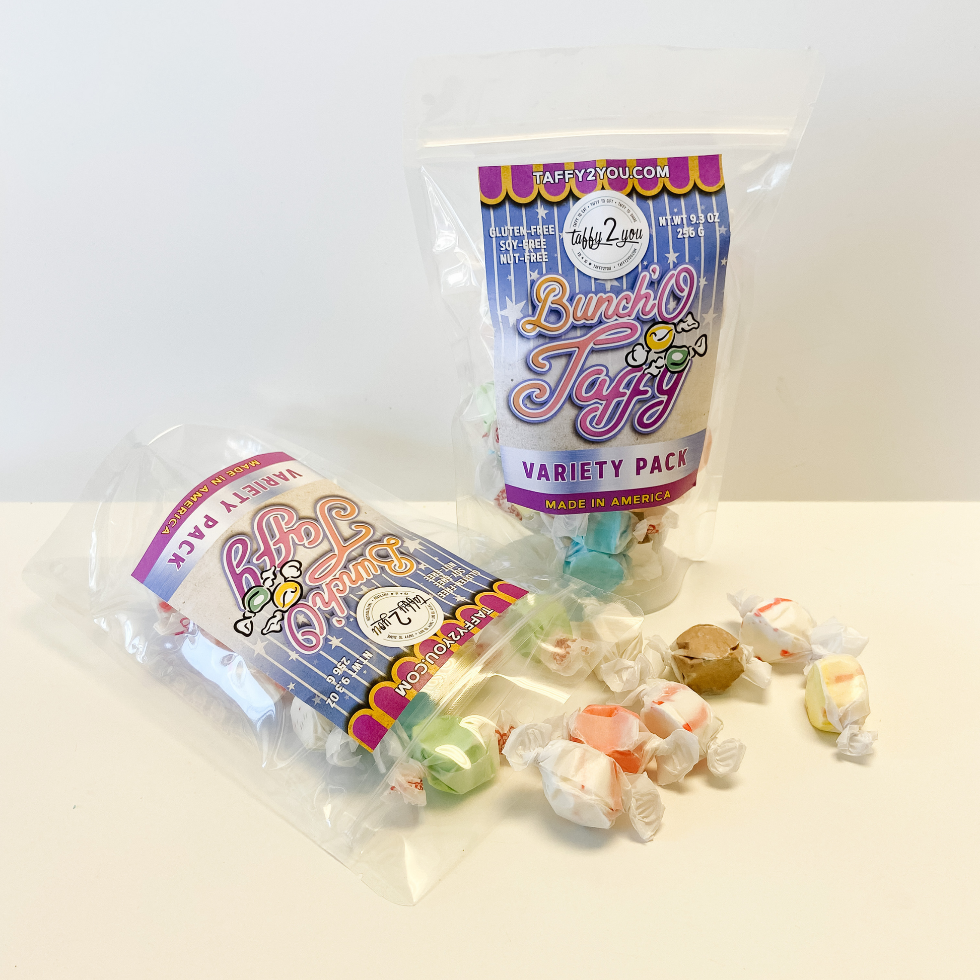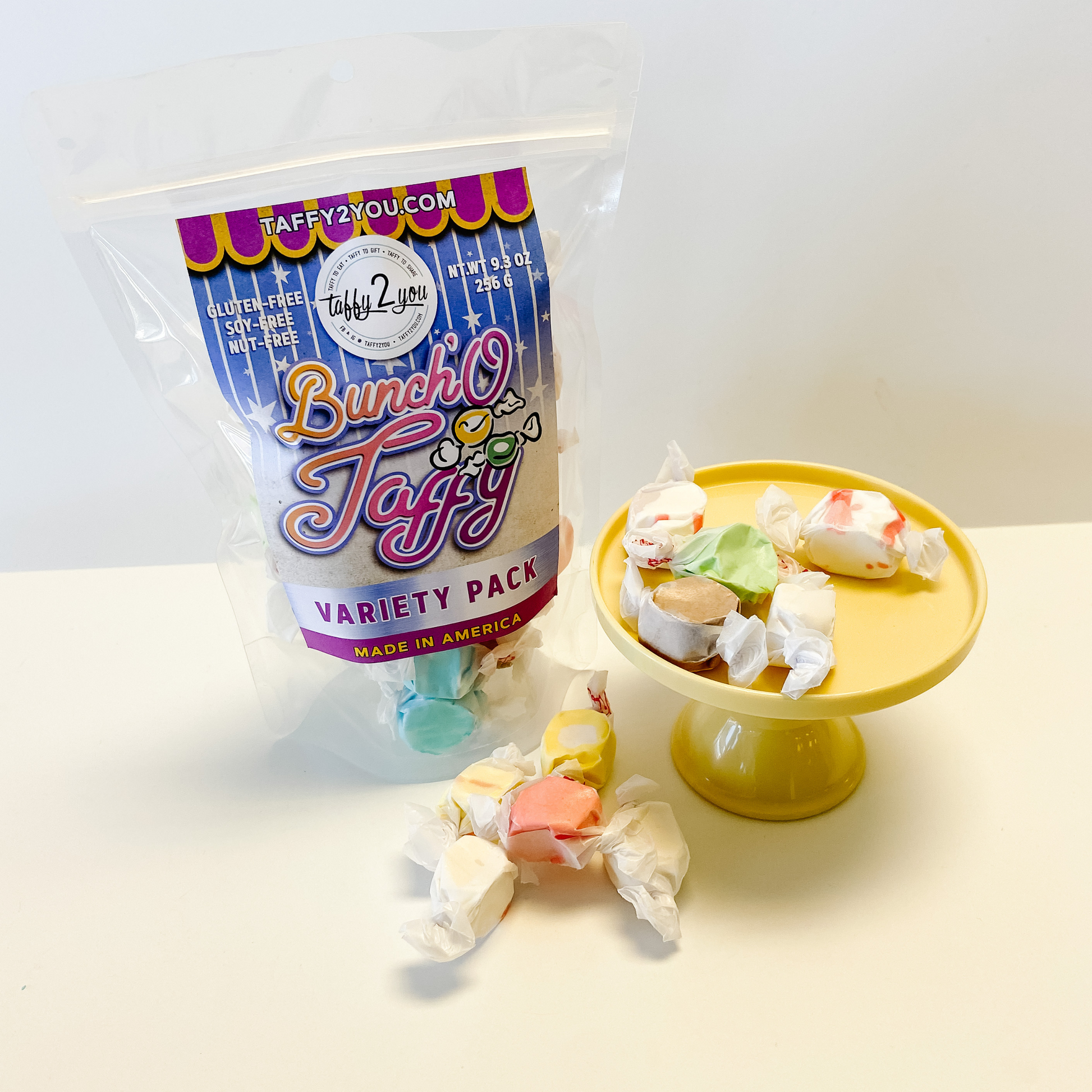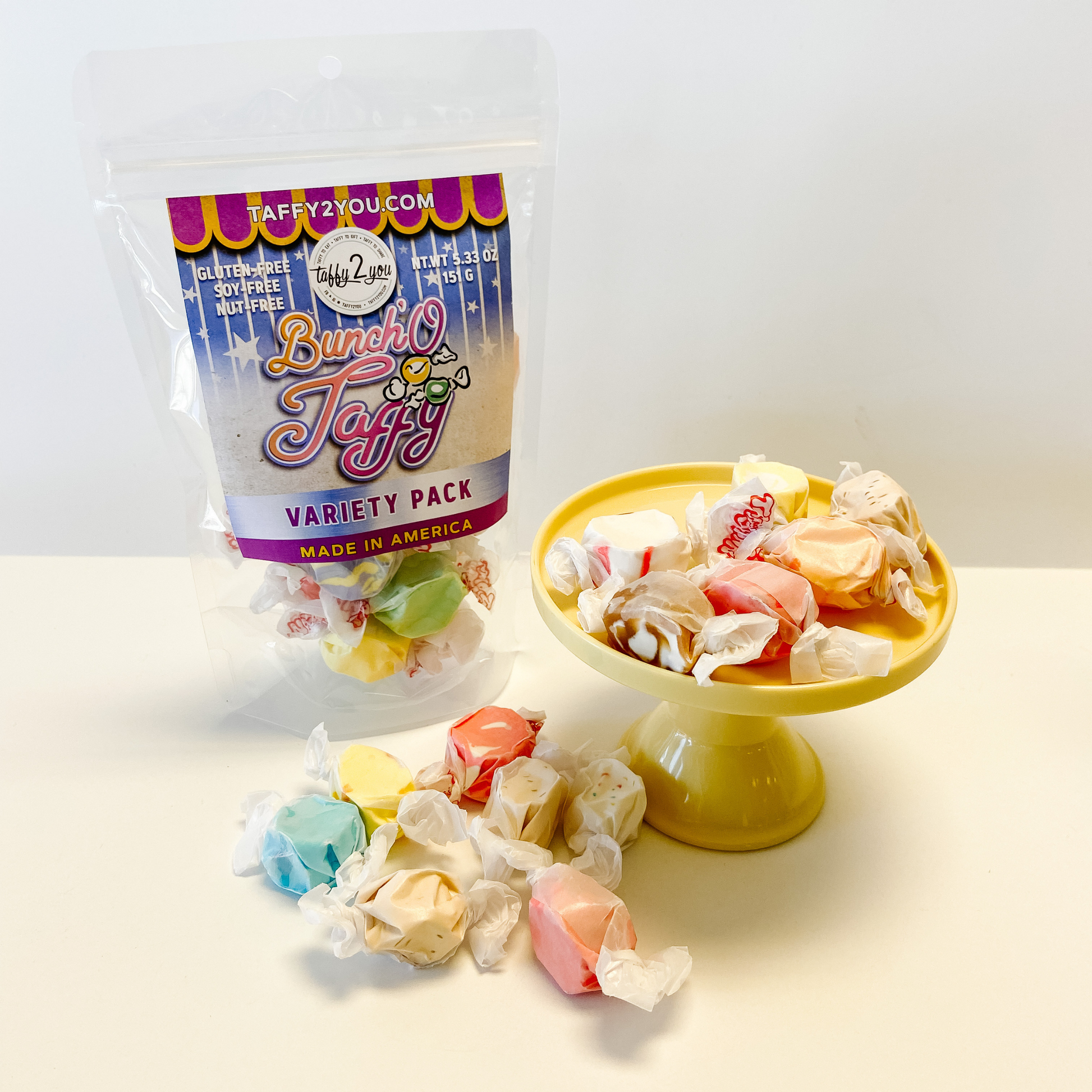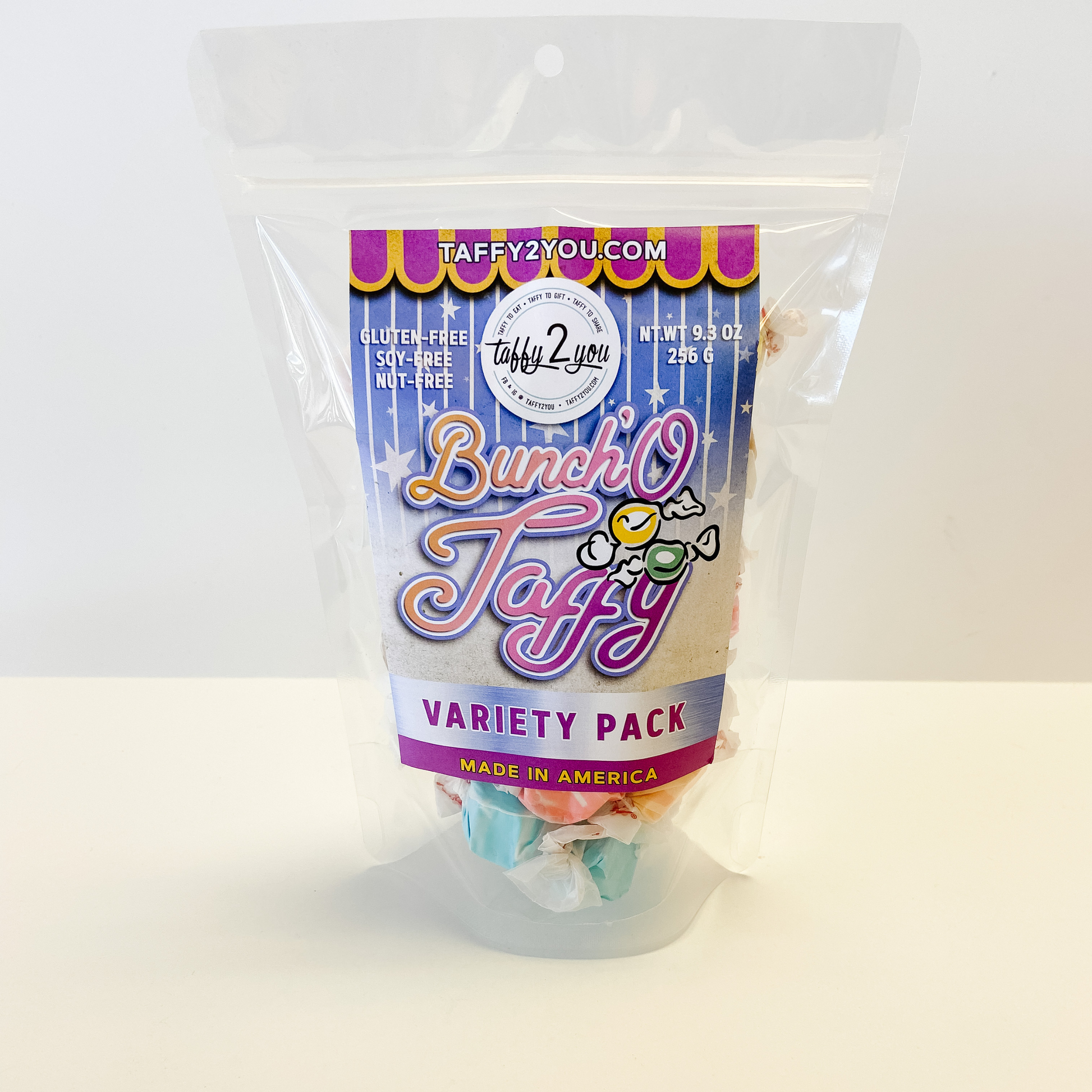 This is our most popular taffy flavor! It's not just one flavor but rather a mix of the most popular 22 available flavors and it out sells every other single flavor 2 to 1. Why? Because although most people have a favorite flavor, most folks enjoy the variety and surprise that comes in this bag. You know you will get a good flavor because by vote all of these are very popular! So let us do the choosing for you and enjoy this variety packed bag!